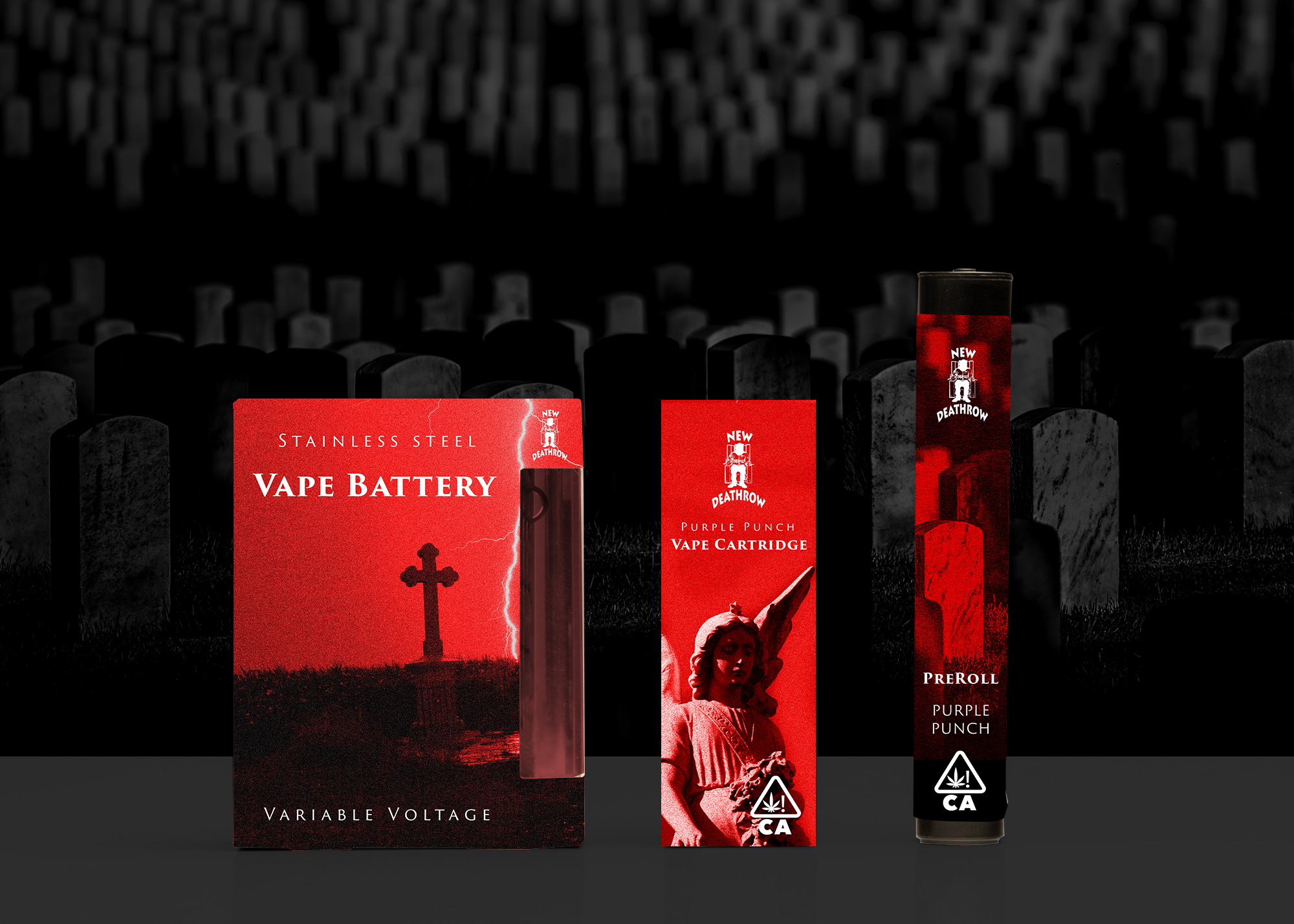 New Death Row Records approached me about creating a line of packaging for a new cannabis line they wanted to release. Being familiar with the legendary music that was made under the label I was very excited to say the least. New Death Row had very limited assets to provide us to get started and no style guide so the small team I lead had a relatively blank canvas to start with. The parameters: NO BLUE, and they like the use of serif fonts. We got to work crafting a direction infusing the brand’s street heritage, through the use of gritty textures and black letter feeling typefaces with its ominous death laden presence cue’d by imagery of cemeteries and religious icons. In the end we created a direction they loved, that could transcend the packaging and expand into their visual identity, but unfortunately the project never saw a public release.